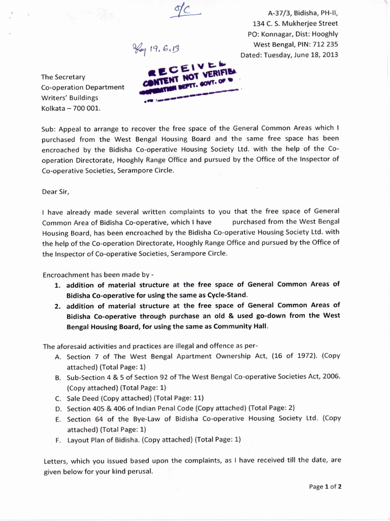 Complaint Letter submitted to the Secretary of Co ...