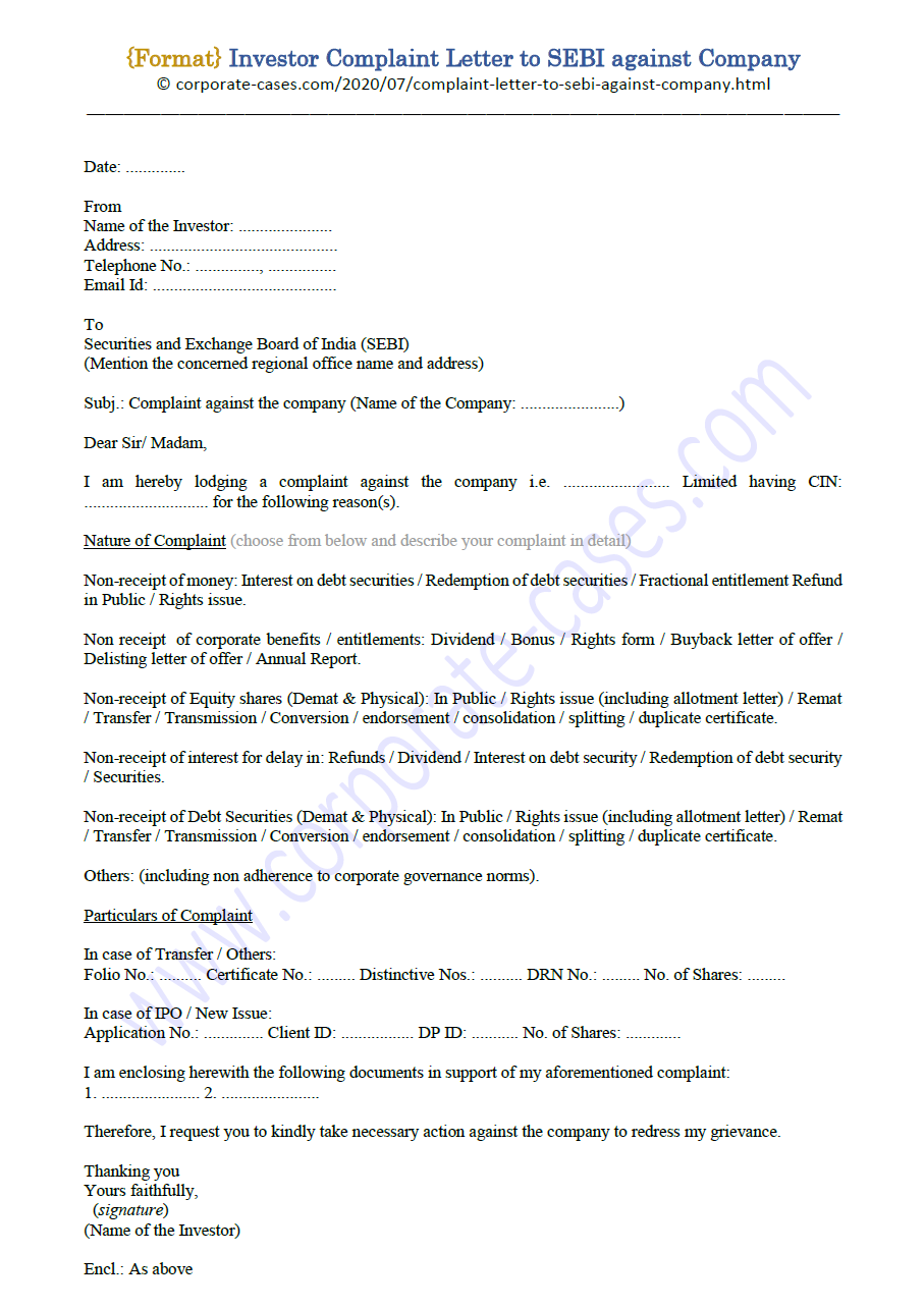 Investor Complaint Letter to SEBI against Company (Format)