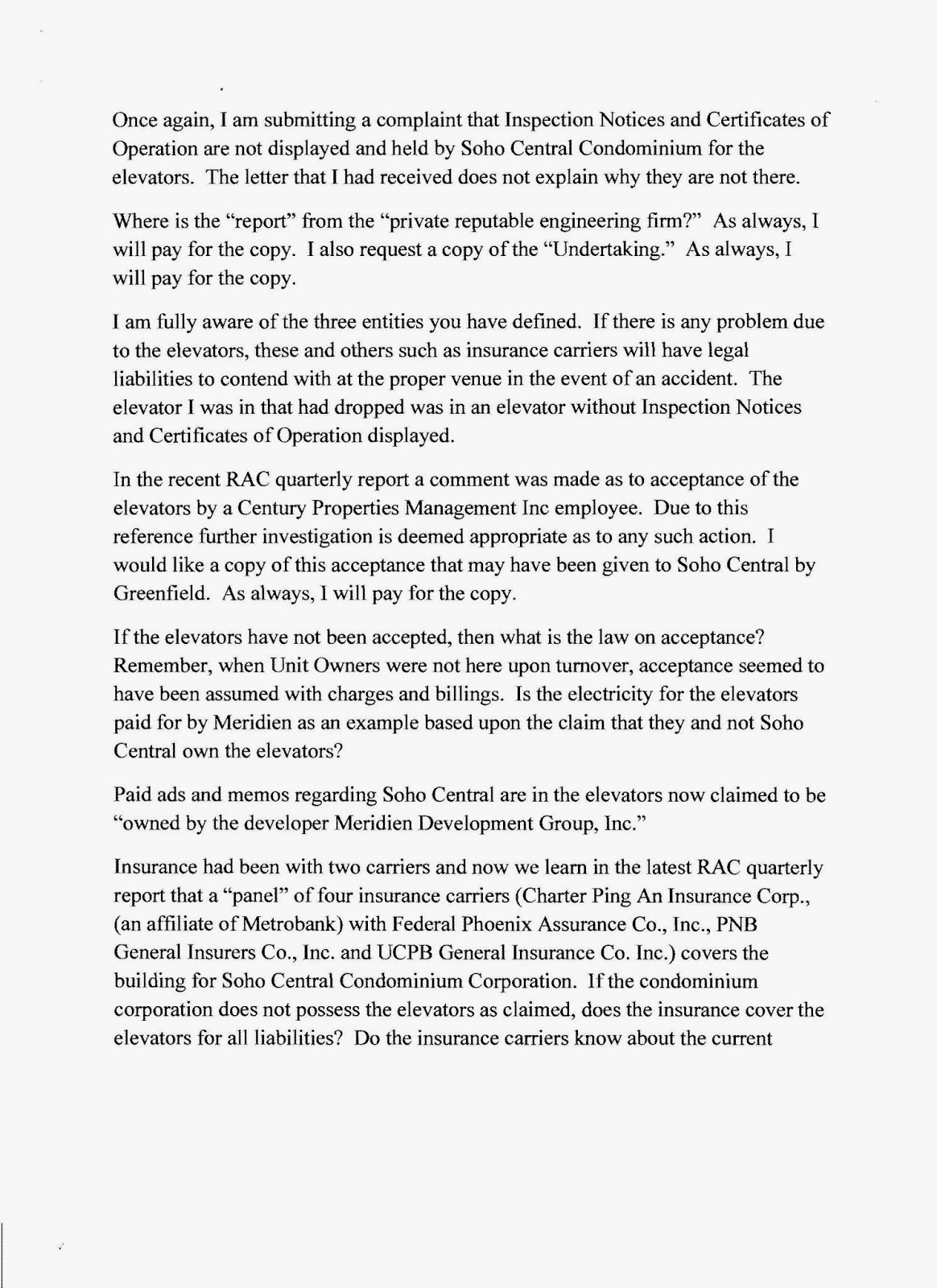 Soho Central Condominium: Follow-up Complaint on Elevator ...
