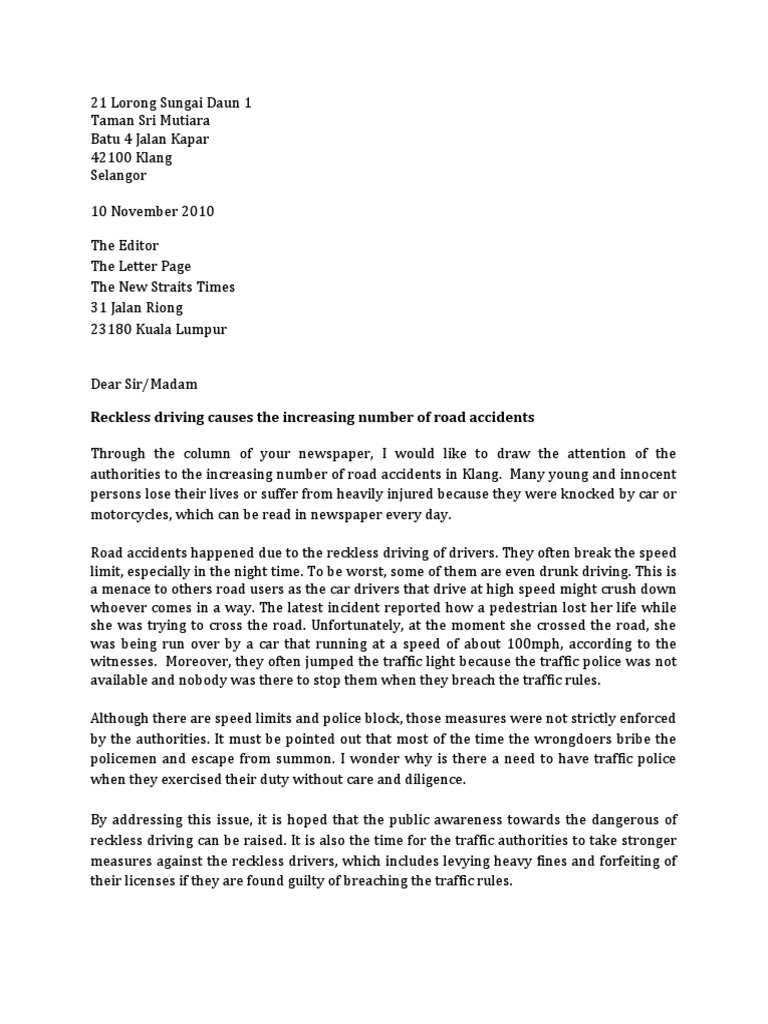 Letters to Editor (Reckless Driving)