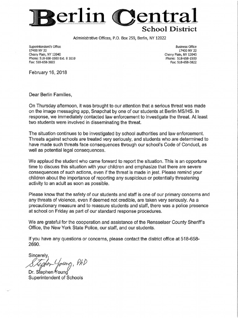 Parent Letter Response to School Threat 02-16-2018