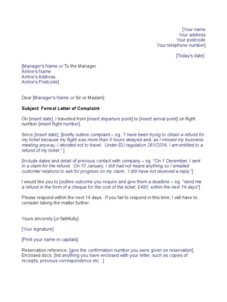 Airline Template Complaint Letter
